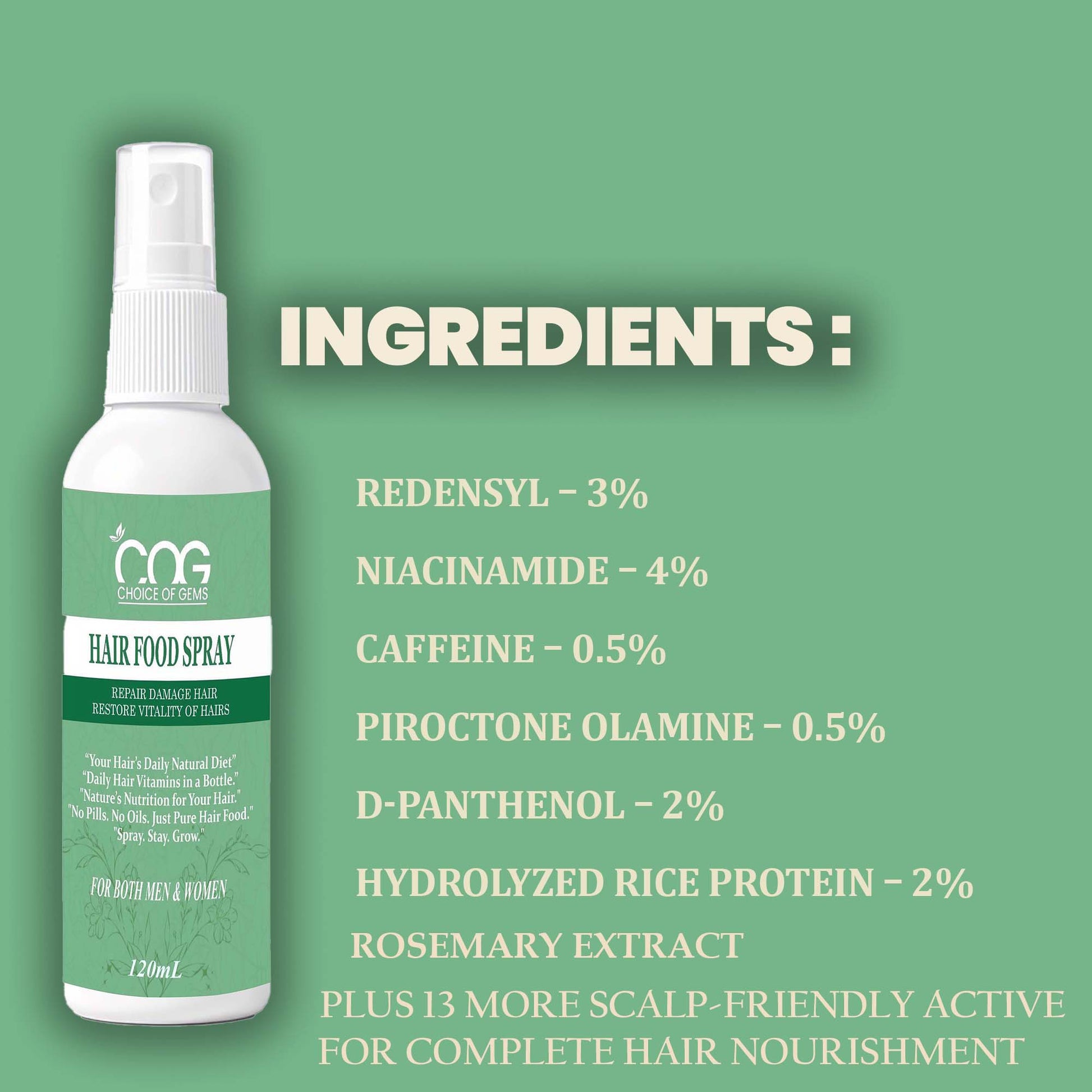 Choice of Gems Hair Food Spray is a lightweight, leave-in scalp and hair vitamin boost powered by 11 natural and active ingredients that work together to stop hair fall in 2 weeks, spark baby hair regrowth, fight white hair, banish dandruff, and deeply hydrate dry scalps.